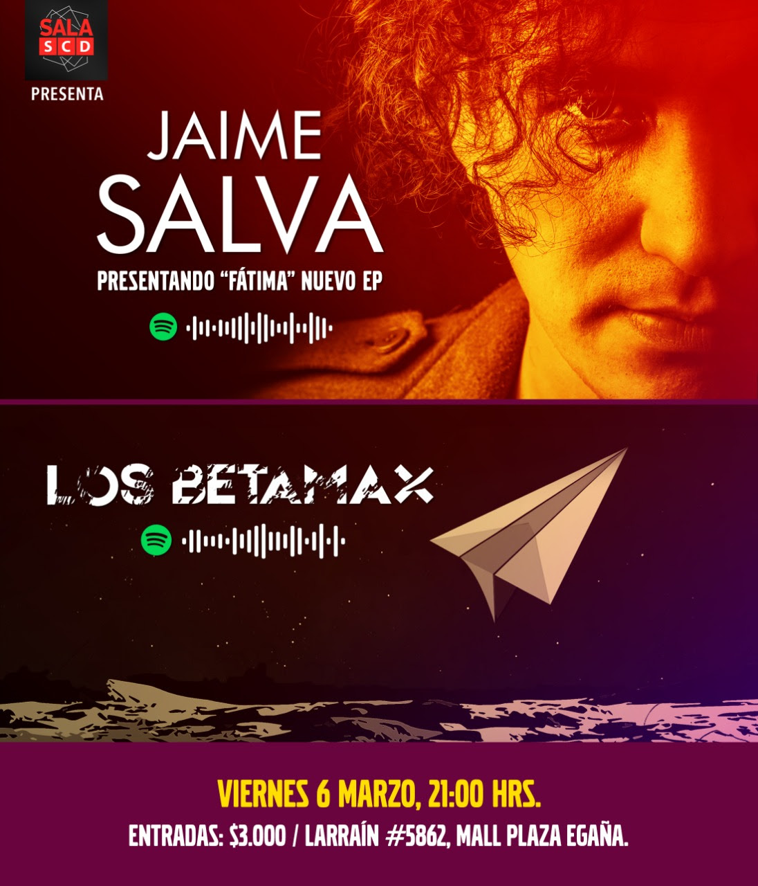 El tecladista y cantante de Tomo Como Rey, Jaime Salva, se prueba como solista. El músico agendó un concierto para el viernes 6 de marzo a las 21:00 horas en la Sala SCD de Plaza Egaña, donde mostrará las canciones de su ep debut “Fátima”. El evento será por partida doble ya que también incluirá al grupo Los Betamax. Las entradas valen $3.000 y se venden por Eventrid y en boleterías de la sala.
