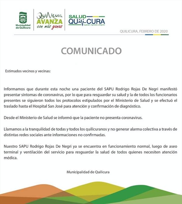 Noticias Minsal por caso sospechoso de coronavirus en Hospital San José: Fue descartado Los protocolos del recinto fueron activados en el momento que la mujer presentó los síntomas. Por Diego Puebla Hernández | 05 Feb, 2020. 11:38 hrs Los protocolos del recinto fueron activados en el momento que la mujer presentó los síntomas. La Municipalidad de Quilicura informó mediante un comunicado que el Ministerio de Salud descartó el posible caso de mujer con coronavirus. La paciente se había presentado en el SAPU de la comuna con síntomas similares a los del virus, por lo que fue rápidamente trasladada al hospital San José, donde se activaron los protocolos correspondientes. En el texto, llamaron a la «tranquilidad de todas y todos los quilicuranos y no generar alarma colectiva a través de distintas redes sociales ante informaciones no confirmadas». coronavirus Aclaración // Era falso: Pareja de abuelitos se despide al enterarse que tienen coronavirus ¡Al estilo Simpsons! Mira la piscina móvil creada por un chileno Sigue a FUTURO.cl en Google Discover Recibe nuestros contenidos directamente en tu feed. Seguir en Google Contenido patrocinado