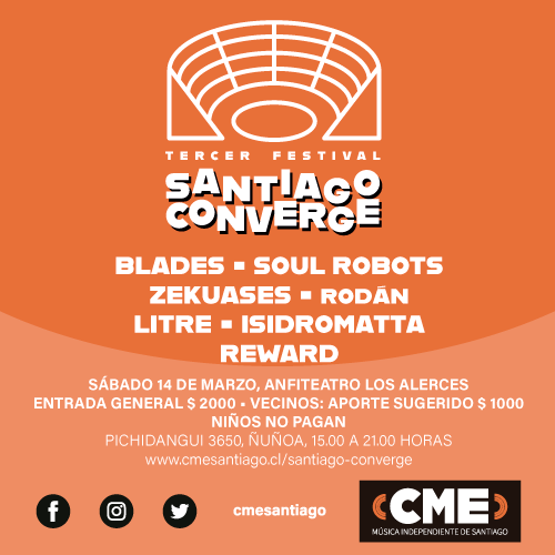Noticias Tercera versión de Festival Santiago Converge congregará a siete bandas en Ñuñoa CME Santiago, que agrupa a un conjunto de proyectos independientes de la capital, efectuará el sábado 14 de marzo la tercera versión de su festival Santiago Converge, el cual se lleva a cabo desde el año 2018. Por Diego Puebla Hernández | 19 Feb, 2020. 12:27 hrs CME Santiago, que agrupa a un conjunto de proyectos independientes de la capital, efectuará el sábado 14 de marzo la tercera versión de su festival Santiago Converge, el cual se lleva a cabo desde el año 2018. CME Santiago, que agrupa a un conjunto de proyectos independientes de la capital, efectuará el sábado 14 de marzo la tercera versión de su festival Santiago Converge, el cual se lleva a cabo desde el año 2018. La actividad, que se desarrollará en el Centro Cultural Los Alerces, congregará a agrupaciones que exploran distintas vertientes musicales de rock, pop y fusión. En esta oportunidad, el lineup está compuesto por Reward (hard rock), IsidroMatta (indie rock), Litre (rock pop), Rodán (rock fusión), Zekuases (rock pop), Soul Robots (rock alternativo) y Blades (rock fusion). Datos generales Festival Santiago Converge: Lugar: Anfiteatro del Centro Cultural Los Alerces, Pichidangui 3650, Ñuñoa. Horario: de 15:00 a 21:00 horas. Valor entrada: $ 2000. Vecinos: valor sugerido de $ 1000. Niños no pagan. Únete al evento Facebook. festival La exitosa película Pacto de Fuga estrena su banda sonora Amon Amarth lanzará juego para celulares Sigue a FUTURO.cl en Google Discover Recibe nuestros contenidos directamente en tu feed. Seguir en Google Contenido patrocinado
