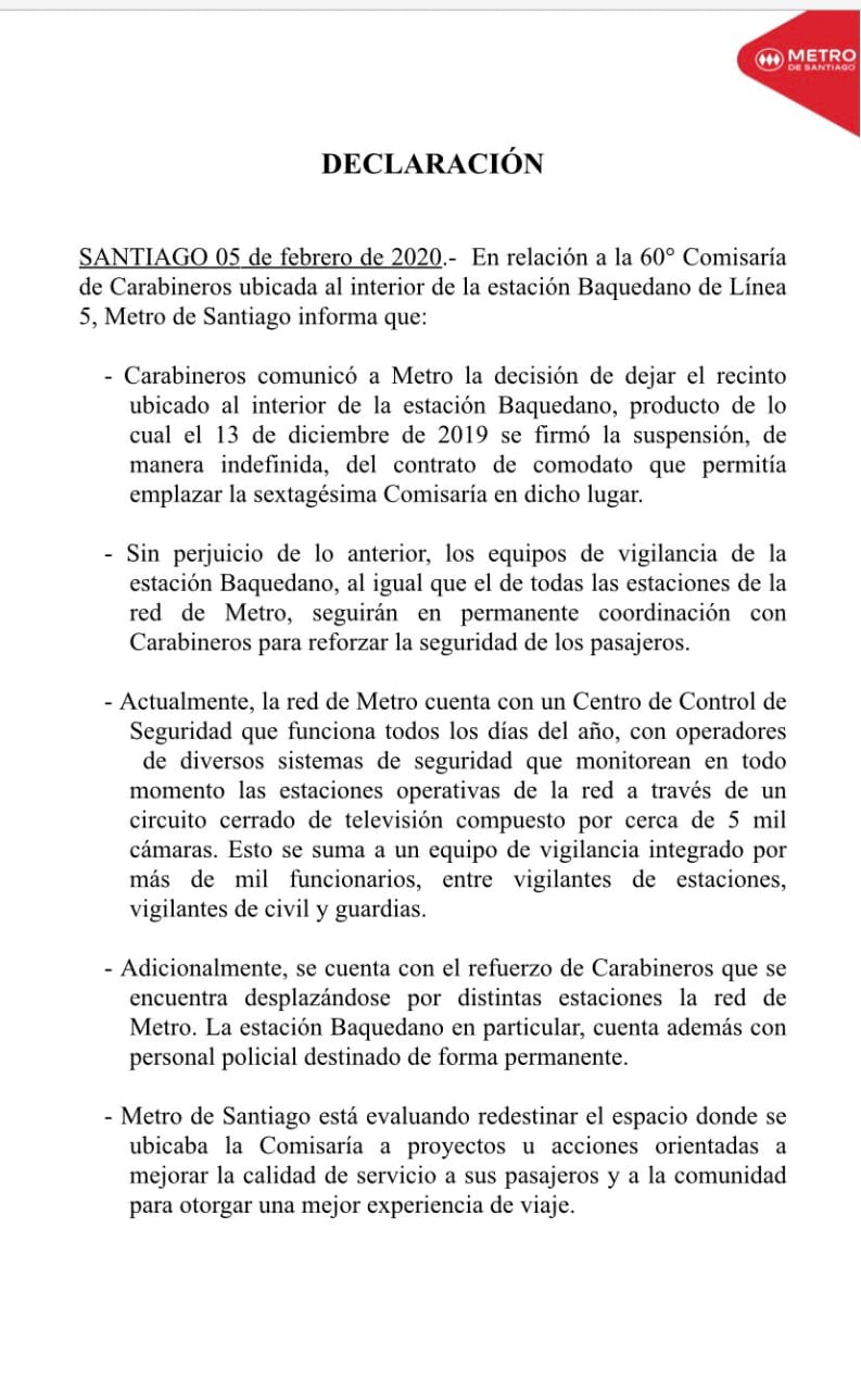 Noticias Último minuto: Metro anuncia cierre de Comisaría en estación Baquedano Carabineros dejará el recinto y la red de trenes subterráneos emitió un comunicado informando la noticia. Por Diego Puebla Hernández | 05 Feb, 2020. 12:38 hrs Carabineros dejará el recinto y la red de trenes subterráneos emitió un comunicado informando la noticia. Durante la jornada de este miércoles 5 de febrero, Metro de Santiago emitió un comunicado, informando el cierre de la 60° Comisaría de Santiago, correspondiente a la Estación Baquedano. Luego del estallido social y las denuncias por torturas dentro de la estación, Carabineros decidió cerrar el recinto luego de los petitorios del sindicato de la red de tren subterráneo. Además informaron que el 13 de diciembre, se firmó la suspensión en la prestación de servicios del departamento de vigilancia de la fuerza policíal en Baquedano. Revisa el comunicado a continuación en Futuro.cl: comisaría Al Pacino olvida el programa en el que está siendo entrevistado Presidente Sebastián Piñera dio inicio a sus vacaciones Sigue a FUTURO.cl en Google Discover Recibe nuestros contenidos directamente en tu feed. Seguir en Google Contenido patrocinado