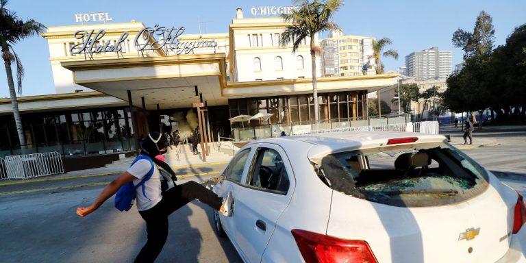 Por otra parte, durante esta jornada se desarrollaron incidentes focalizados en la Plaza Sucre y en el frontis del Hotel O’Higgins. Un centenar de personas empleó objetos contundentes y extintores para lanzarlos en contra del emblemático sitio de alojamiento. En las afueras del recinto, el interior de un automóvil fue incendiado.
