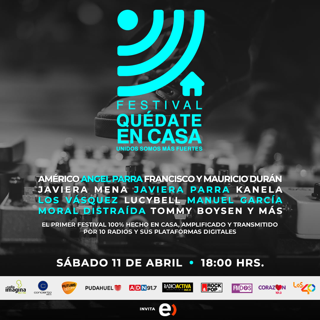 A través de las plataformas digitales de las radios Futuro, Concierto, ADN, Activa, Rock & Pop, LOS40, FMDos, Corazón, Pudahuel e Imagina, y amplificado en las señales FM en todo Chile de cada una de las emisoras, transmitiremos el festival Quédate En Casa el próximo sábado 11 de abril, desde las 18 hrs.
