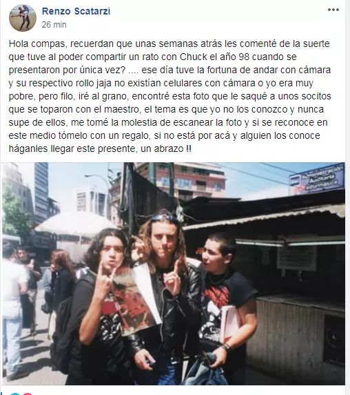 «Ese día tuve la fortuna de andar con cámara y su respectivo rollo. Encontré esta foto que le saqué a unos socitos que se toparon con el maestro. Yo no los conozco, y me tomé la molestia de escanear la foto. Si se reconoce, tómelo como un regalo» dice Renzo en su cuenta personal de Facebook, en la imagen viralizada por el sitio iRock.cl.