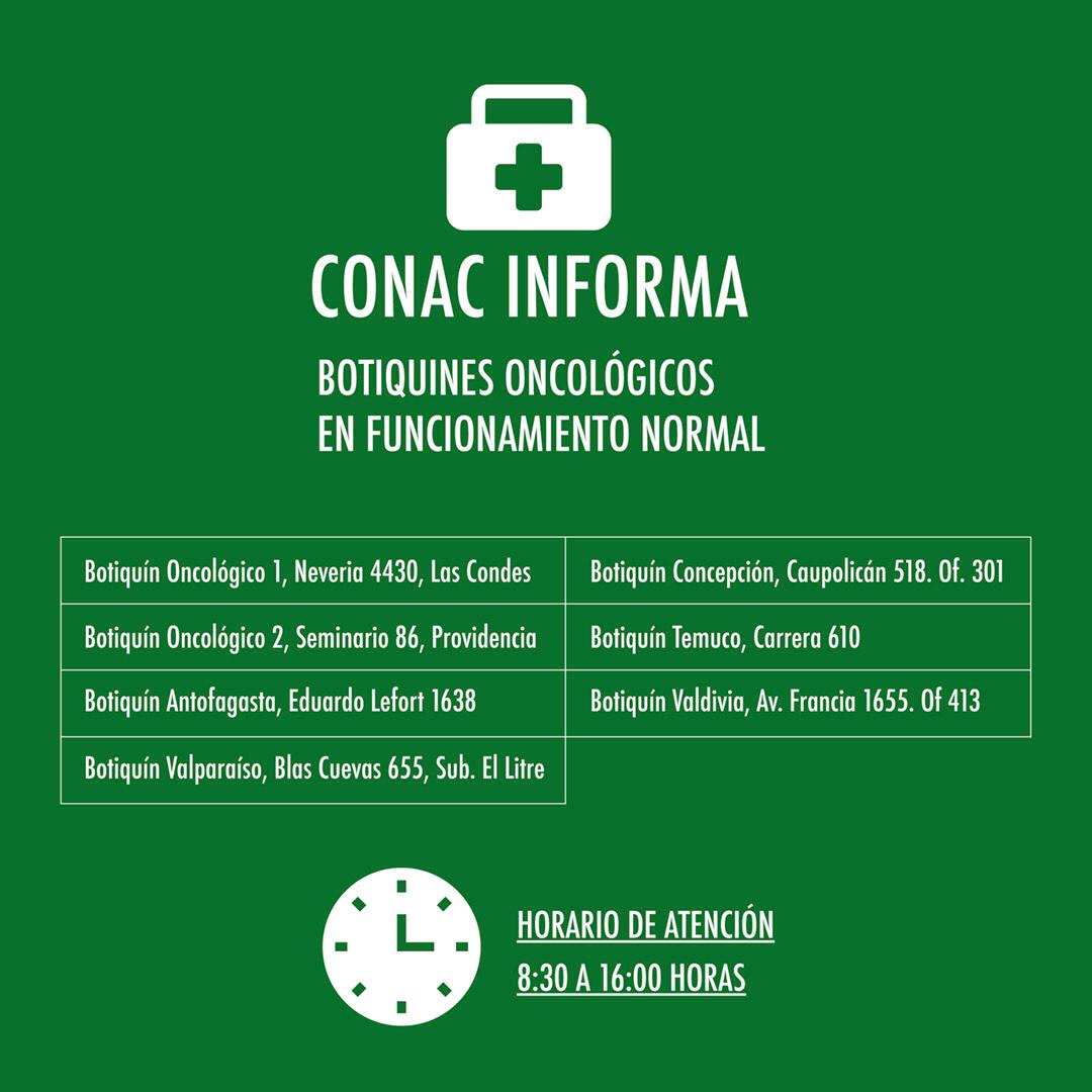 Así mismo, siguen funcionando para venta presencial los botiquines oncológicos de Santiago, Antofagasta, Valparaíso, Concepción, Temuco y Valdivia de 8.30 a 16.00 hrs. Más información en https://conac.cl/