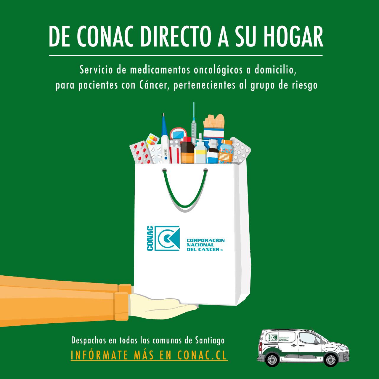 El despacho se solicita en https://www.redconac.cl/solicitar-medicamento/ o escribiendo al correos Botiquin2@conac.cl y serviciodomicilio@conac.cl Los medicamentos son enviados de lunes a viernes de 9:00 a 16:00 hrs. a todas la comunas de provincia de Santiago.