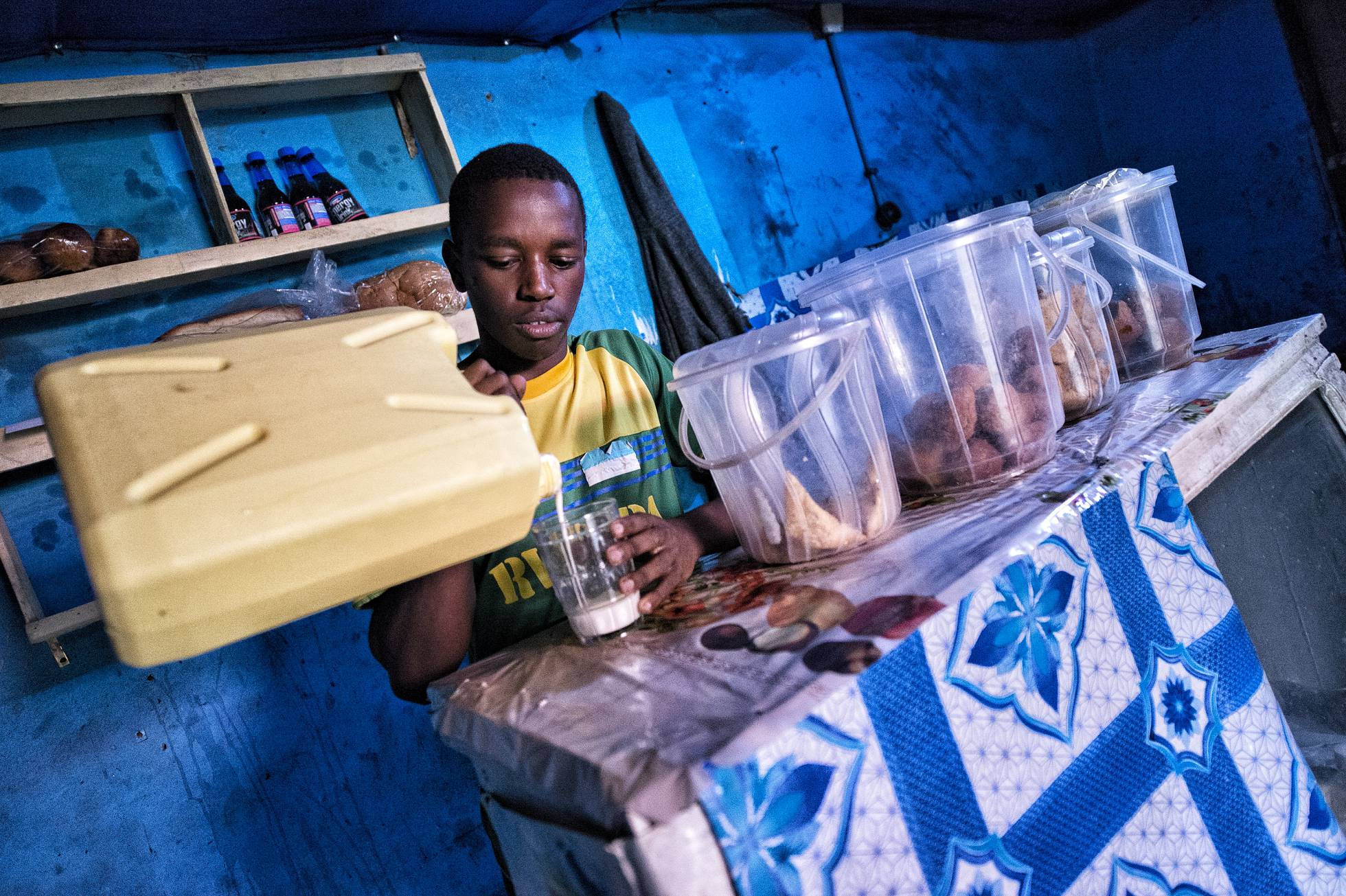 Pero no todo es éxito en el mundo empresarial. Elie Niyishobora, de 23 años, ha entrado en este mercado hace sólo dos meses. Se asoció con su amigo de la infancia Athanase Hafashimana, de 24 años, y después de pensar qué negocio podían montar juntos decidieron abrir un pequeño Amata Meza ya que no requería de una gran inversión. «Al principio el negocio funcionaba muy bien, pero hemos ido perdiendo clientes las últimas semanas”, cuenta con una sonrisa de resignación. Su local es pequeño y oscuro, con mesas y taburetes bajos y un mostrador con todo tipo de aperitivos y varios termos con leche caliente, white coffee (con un poco de té) y gachas a base de cereales. Cada mañana llega el repartidor en su bicicleta y le entrega 10 litros de una granja cercana, que es todo lo que Elie consigue vender en un día, a diferencia de sus vecinos Hasna y Alexis, que venden entre 150 y 200 litros al día.