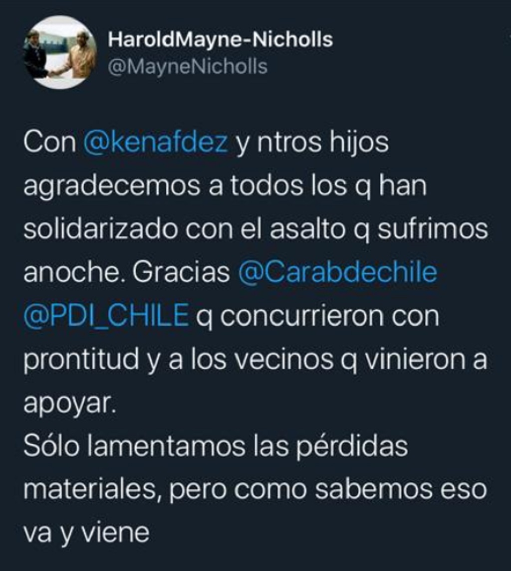“Con @Kenafdez y nuestro hijos agradecemos a todos los que han solidarizado con el asalto que sufrimos anoche, @Crabdechile @PDI_CHILE que concurrieron con prontitud y a los vecinos que vinieron a apoyar. Sólo lamentamos las pérdidas materiales, pero como sabemos eso va y viene”.