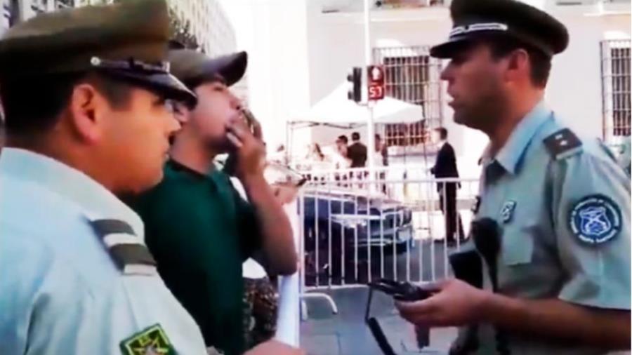 El hecho ocurrió a las afueras de La Moneda, cuando un joven pifiaba sin parar, lo que provocó que dos carabineros se acercaron a él y le pidieron sus documentos. Procedió a sacar su billetera con una mano y con la otra siguió pifiando.