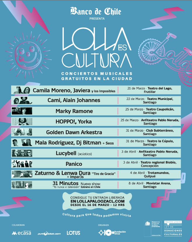 Además de los sideshows y el evento propiamente tal, que se realizará entre el 27 y 29 de marzo en Parque O’Higgins, Lollapalooza Chile realizará diez conciertos gratuitos en Santiago, Quilpué, Concepción y Frutillar. La iniciativa, encabezada por la Fundación Lotus, tiene como propósito llevar parte del festival a otras ciudades y además promocionar a nuevos talentos.
