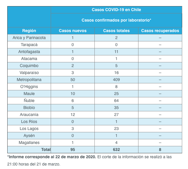 Noticias Ministerio de Salud informó de 632 casos de coronavirus en Chile Jaime Mañalich confirmó que se sumaron 95 nuevos contagiados a la fecha. De los confirmados, 409 son de la Región metropolitana. Por Hector Muñoz Tapia | 22 Mar, 2020. 10:36 hrs Jaime Mañalich confirmó que se sumaron 95 nuevos contagiados a la fecha. De los confirmados, 409 son de la Región metropolitana. Esta mañana, el ministro de Salud, Jaime Mañalich entregó las nuevas cifras de contagio de coronavirus en Chile. Tras el corte a las 21 horas del sábado 21 de marzo, la cifra de casos confirmados en Chile ascendió a 632 personas, siendo las regiones Metropolitana (409) y Ñuble (64) las más afectadas. Son 95 los nuevos casos respecto al último reporte, indicando además 8 recuperados en el país. El ministro de Salud apuntó que «durante los últimos cuatro días estamos estabilizados, a pesar de que se están haciendo muchos más exámenes diariamente, en alrededor de 100 casos nuevos cada día». NOTICIA EN DESARROLLO Mapa Coronavirus Infogram coronavirus jaime mañalich Ministerio de Salud Gobierno de Chile decreta toque de queda en todo el país por coronavirus La UE pide a Netflix que baje su calidad por riesgo de colapso por demanda por el covid-19 Sigue a FUTURO.cl en Google Discover Recibe nuestros contenidos directamente en tu feed. Seguir en Google Contenido patrocinado