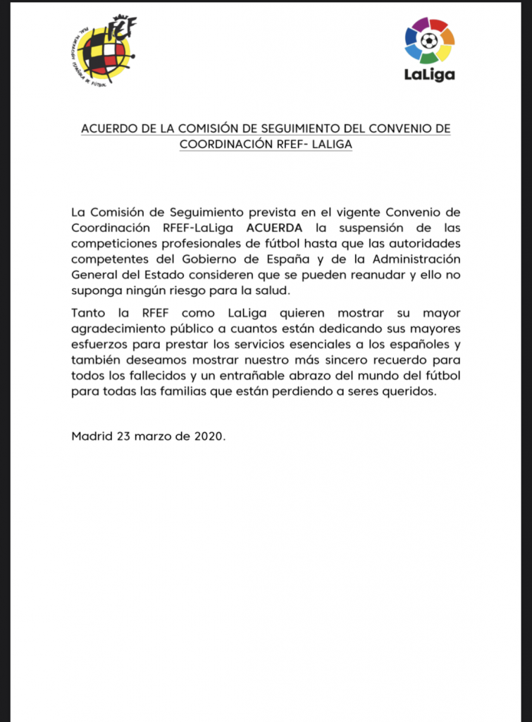 A través de un comunicado, la Real Federación de Fútbol Española y La Liga anunciaron la suspensión total de los campeonatos hasta que las autoridades lo estimen conveniente.