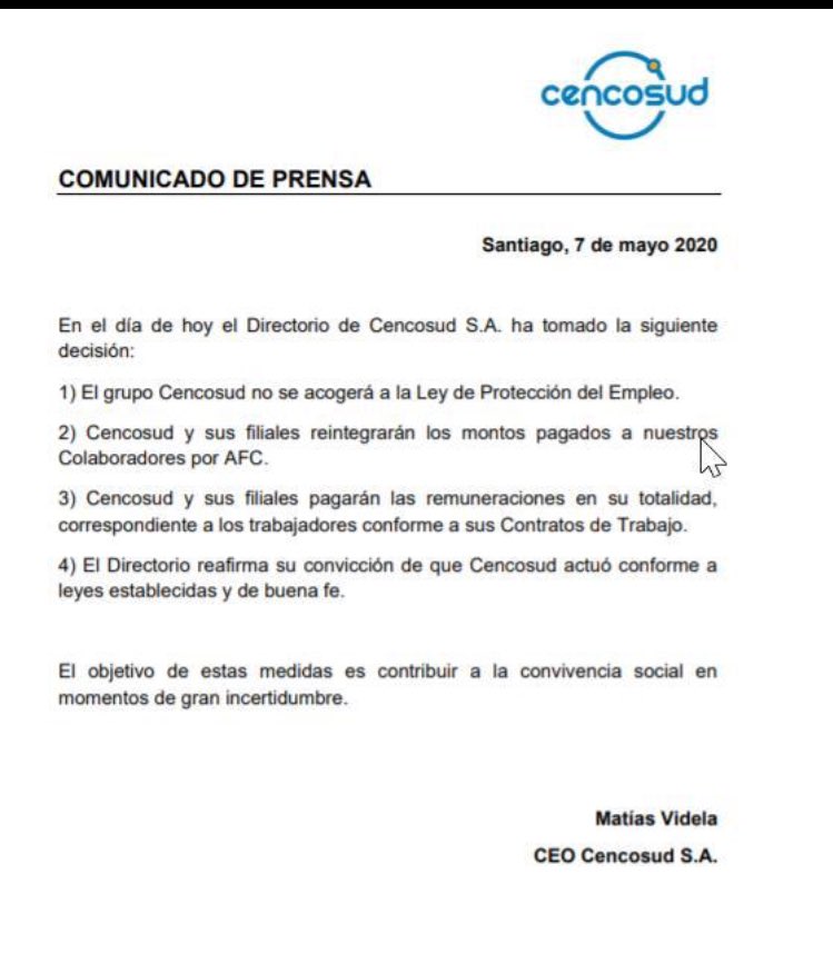 Noticias Cencosud decide no acogerse a la Ley de Protección al Empleo La decisión llegó tras las críticas surgidas, después de que se revelara que distribuyeron millonarias utilidades a sus accionistas. Por Hector Muñoz Tapia | 07 May, 2020. 13:12 hrs La decisión llegó tras las críticas surgidas, después de que se revelara que distribuyeron millonarias utilidades a sus accionistas. Después de los cuestionamientos recibidos durante los últimos días, Cencosud informó que no se acogerá a la Ley de Protección al Empleo. Por medio de un comunicado, el grupo señaló que el directorio de la sociedad anónima reintegrarán los montos pagados a los colaboradores por medio de la AFC: «Cencosud y sus filiales pagarán las remuneraciones en su totalidad, correspondiente a los trabajadores conforme a sus Contratos de Trabajo». Recordemos que Cencosud fue fuertemente criticado, por ampararse en la ley, cuando días después repartió millonarias utilidades a sus accionistas. Cencosud PODCAST FUTURO: Matilda Svensson y Five Finger Death Punch Ya que parlamentarios rechazaron fijar montos de rebaja, "es incierto lo que va a pasar" dice diputado Gabriel Boric Sigue a FUTURO.cl en Google Discover Recibe nuestros contenidos directamente en tu feed. Seguir en Google Contenido patrocinado