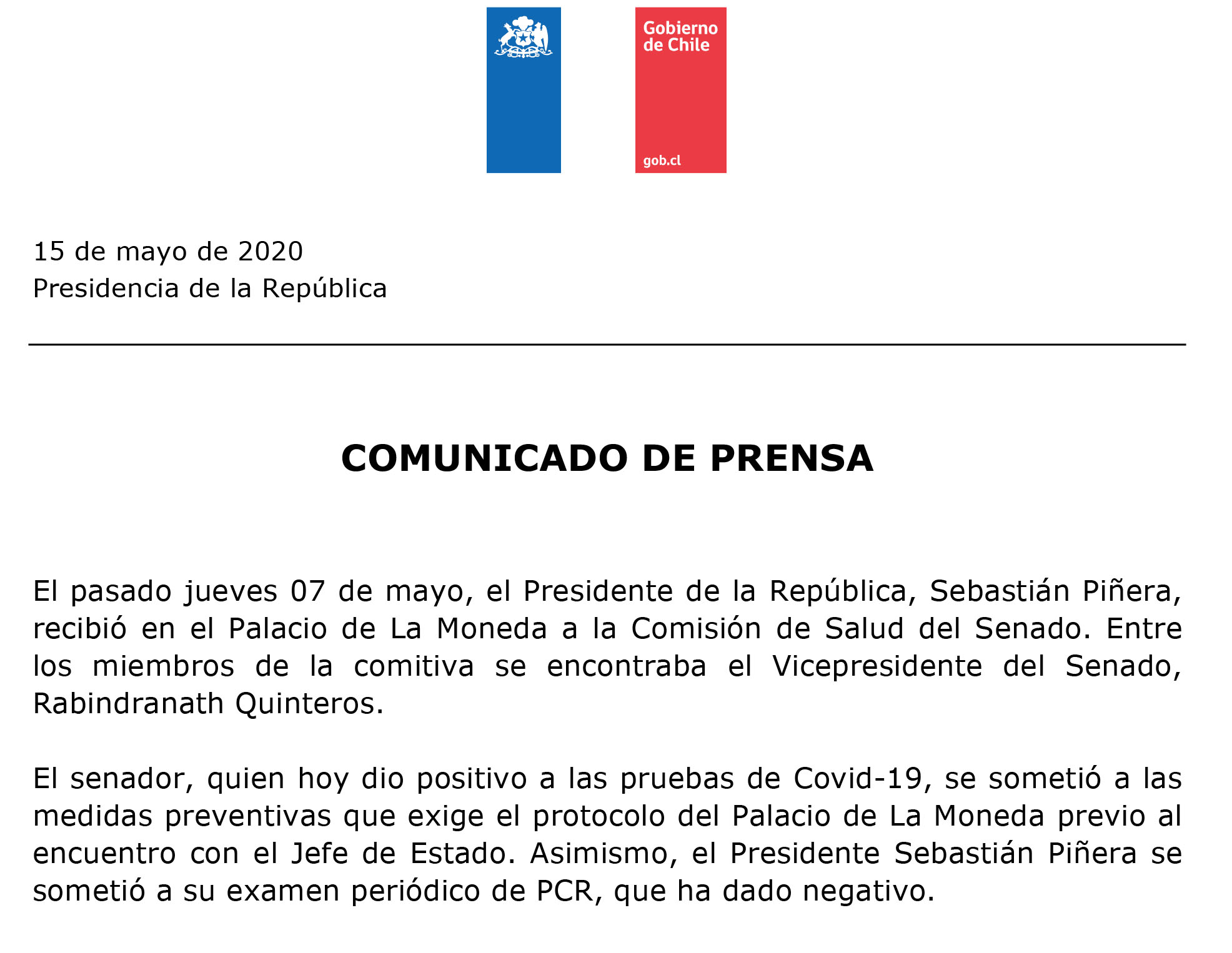 Noticias Piñera dio negativo en test de Covid-19 tras contacto con senador contagiado de coronavirus El Presidente de la República se había reunido con el vicepresidente de la Cámara Alta, Rabindranath Quinteros, quien se encuentra en cuarentena tras haber sido contagiado. Por Hector Muñoz Tapia | 15 May, 2020. 17:46 hrs El Presidente de la República se había reunido con el vicepresidente de la Cámara Alta, Rabindranath Quinteros, quien se encuentra en cuarentena tras haber sido contagiado. Depsués de conocerse el caso del senador Rabindranath Quinteros, quien dio positivo por Covid-19, desde La Moneda informaron que el Presidente Sebastián Piñera arrojó negativo por coronavirus. En un comunicado, desde la sede de Gobierno indicaron que efectivamente el Mandatario recibió el 7 de mayo a la comisión de Salud del Senado, a la que Quinteros pertenece: «El senador, quien hoy (viernes) dio positivo a las pruebas de Covid-19, se sometió a las medidas preventivas que exige el protocolo del Palacio de La Moneda previo al encuentro con el Jefe de Estado. Asimismo, el Presidente Sebastián Piñera se sometió a su examen periódico de PCR, que ha dado negativo». actualidad Covid-19 Sebastián Piñera ¡Idénticas! Emilia Clarke chilena causa furor en TikTok con sus videos PODCAST FUTURO: El cuento del Lobo, capítulo 04, Ronnie James Dio Sigue a FUTURO.cl en Google Discover Recibe nuestros contenidos directamente en tu feed. Seguir en Google Contenido patrocinado