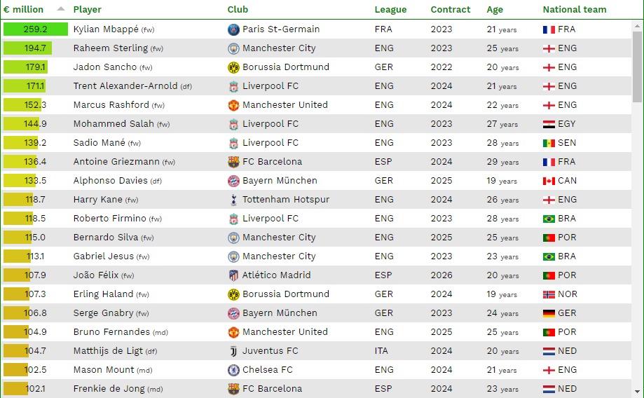 El estudio está estructurado en base a las cinco mejores liga del mundo: España, Inglaterra, Italia, Francia y Alemania. En cuanto a otras figuras, en España quien tiene mejor precio es el francés Antoine Griezmann, del FC Barcelona, con un valor de 136,4 millones de euros, seguido por el portugués Joao Felix, del Atlético de Madrid, con 107,9