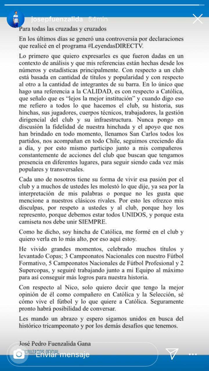 “Con respecto al Nico, solo quiero decir que tengo la mejor opinión de él como compañero en Católica y la Selección, sé cómo vive el fútbol y lo que quiere a Católica. Seguramente pronto habrá posibilidad de conversar” dejando la polémica de lado publicando un comunicado en su Instagram.