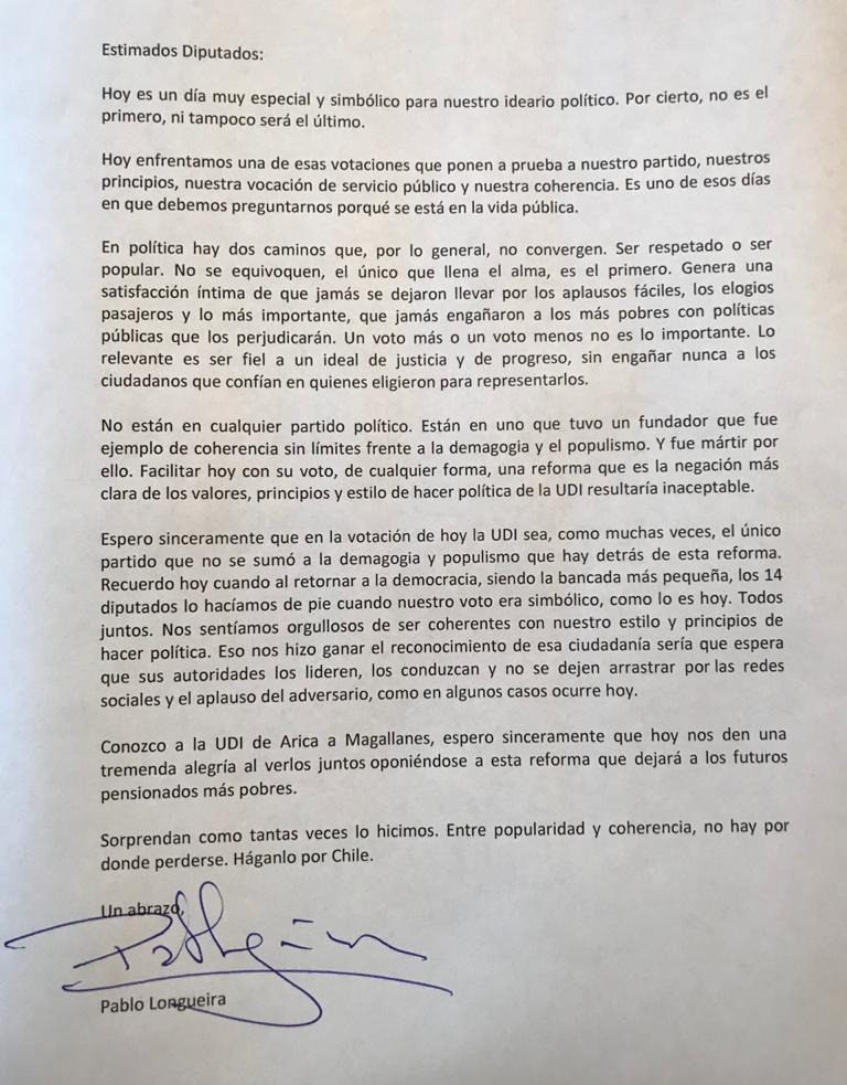 A través de una carta, Pablo Longueira, quiso entregar un mensaje a los diputados de su colectividad, en medio de las discusión sobre la reforma constitucional que permitiría el retiro de fondos de la AFP.
