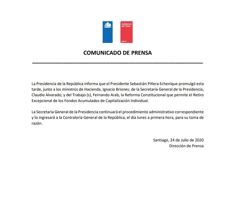 Desde La Moneda asegurarn: La Presidencia de la República informa que el Presidente Sebastián Piñera Echenique promulgó este viernes, junto a los ministros de Hacienda, Ignacio Briones; de la Secretaría General de la Presidencia, Claudio Alvarado; y del Trabajo (s), Fernando Arab, la Reforma Constitucional que permite el Retiro Excepcional de los Fondos Acumulados de Capitalización Individual. La Secretaría General de la Presidencia continuará el procedimiento administrativo correspondiente y lo ingresará a la Contraloría General de la República, el día lunes a primera hora, para su toma de razón».
