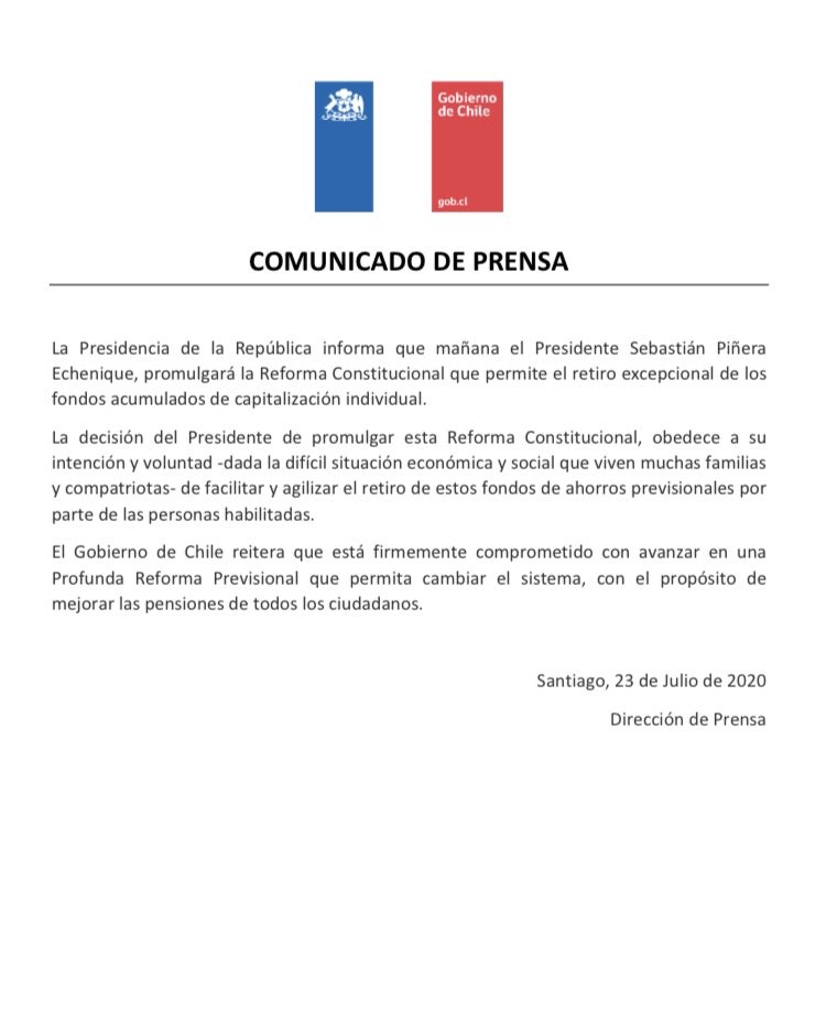 Noticias Presidente Piñera promulgará este viernes la ley de retiro del 10% de las AFP La Moneda lo confirmó a través de un comunicado oficial. Por Hector Muñoz Tapia | 23 Jul, 2020. 18:49 hrs Esta jornada, a través de un comunicado oficial, el Palacio de La Moneda confirmó que el Presidente Sebastián Piñera promulgará este viernes la ley que permite el retiro “excepcional” del 10% de los fondos de las AFP. El escrito dice: «La decisión del Presidente de promulgar esta reforma constitucional, obedece a su intención y voluntad —dada la difícil situación económica y social que viven muchas familias y compatriotas— de facilitar y agilizar el retiro de estos fondos de ahorros previsionales por parte de las personas habilitadas. El Gobierno de Chile reitera que está firmemente comprometido con avanzar en una profunda Reforma Previsional que permita cambiar el sistema, con el propósito de mejorar las pensiones de todos los ciudadanos». Esto se suma a la determinación que tomó la bancada de senadores de Chile Vamos, quienes confirmaron, en voz de Andrés Allamand, que no llevarán el proyecto al Tribunal Constitucional (TC). NOTICIA EN DESARROLLO actualidad AFP Sebatián Piñera Felipe Alessandri: “En el congreso se entrampan en peleas estériles que buscan dividendos políticos y no solucionar problemas” Paul Stanley de Kiss pide compasión por la salud mental de Kanye West Sigue a FUTURO.cl en Google Discover Recibe nuestros contenidos directamente en tu feed. Seguir en Google Contenido patrocinado