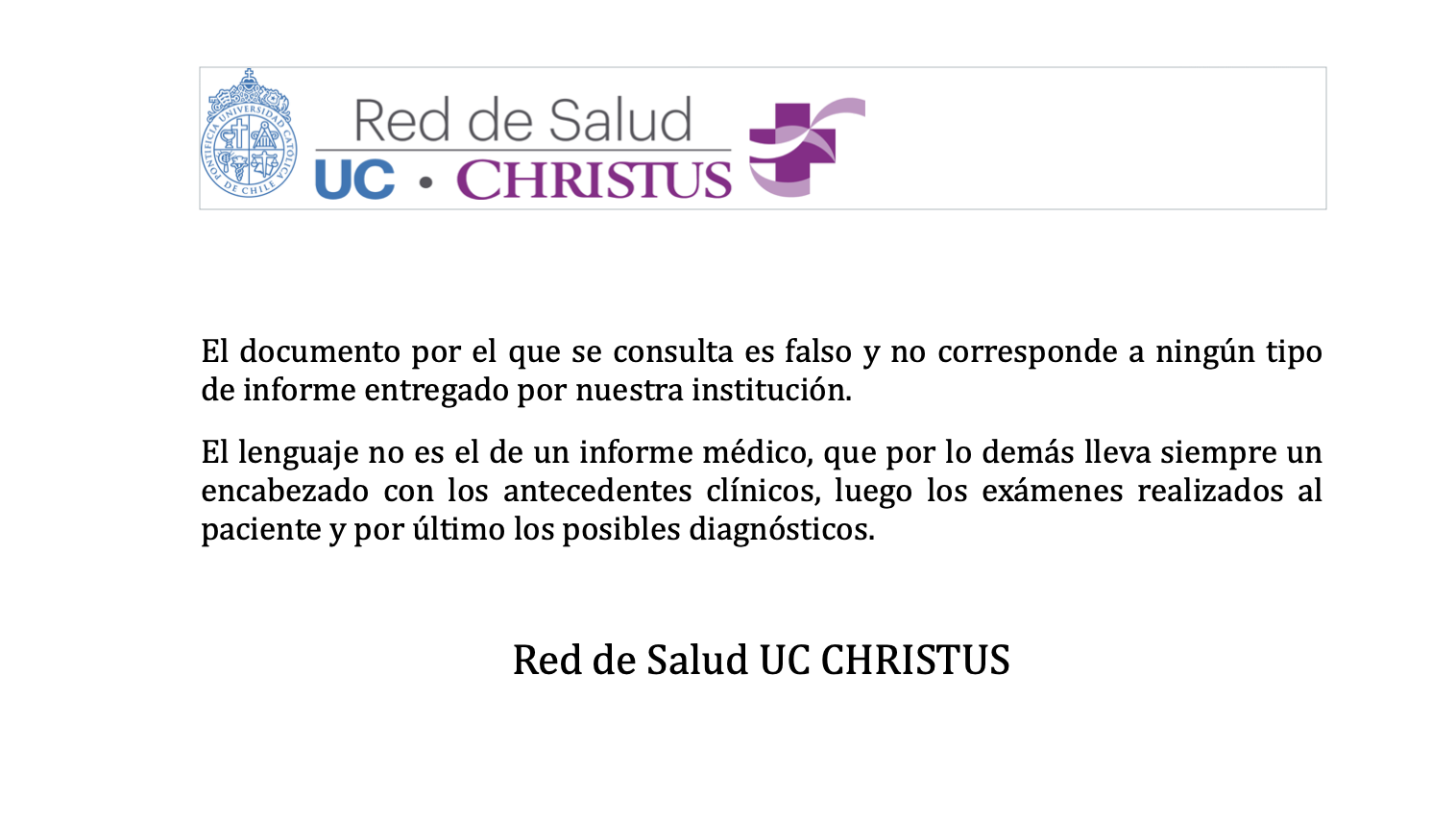 Noticias UC Christus desmintió imagen de supuesto informe médico del Presidente Piñera “No corresponde a ningún tipo de informe entregado por nuestra institución”, aseguraron desde la red de salud a través de un comunicado. Por Hector Muñoz Tapia | 02 Jul, 2020. 09:02 hrs “No corresponde a ningún tipo de informe entregado por nuestra institución”, aseguraron desde la red de salud a través de un comunicado. UC Christus aseguró a través de un comunicado que la imagen que se ha viralizado con un supuesto informe médico del Presidente Sebastián Piñera es completamente falsa. Desde la red de salud indicaron que «el documento por el que se consulta es falso y no corresponde a ningún tipo de informe entregado por nuestra institución». Agregaron que «el lenguaje no es el de un informe médico», y que este tipo de escrito «lleva siempre un encabezado con los antecedentes clínicos, luego los exámenes realizados al paciente y por último los posibles diagnósticos». actualidad Sebastián Piñera UC Christus Doctor Sebastián Ugarte llegaría a la mesa del ministro Paris La Carpa del Diablo – Capítulo 248 Sigue a FUTURO.cl en Google Discover Recibe nuestros contenidos directamente en tu feed. Seguir en Google Contenido patrocinado