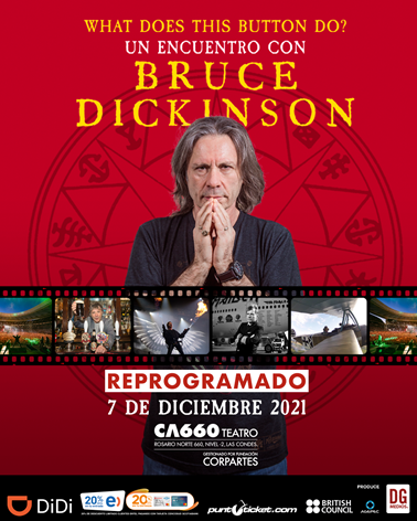 El show conversatorio WHAT DOES THIS BUTTON DO?, un encuentro con Bruce Dickinson actualmente programado para el 23 de agosto de 2020, ha sido pospuesto debido a la pandemia de Covid 19 para el día 7 de diciembre de 2021 en CA660 Teatro Corpartes.