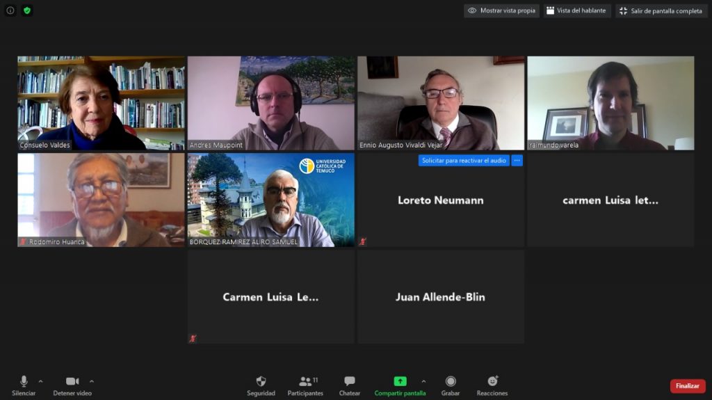 Al encuentro virtual asistieron Ennio Vivaldi, rector de la Universidad de Chile; Juan Allende Blin, compositor y último galardonado con el Premio Nacional de Artes Musicales, quien se conectó desde Alemania; Andrés Maupoint Álvarez, profesor de la Facultad de Artes de la Universidad de Chile, miembro de número y representante de la Academia Chilena de Bellas Artes; Aliro Bórquez, rector de la Universidad Católica de Temuco y representante del Consejo de Rectores.
