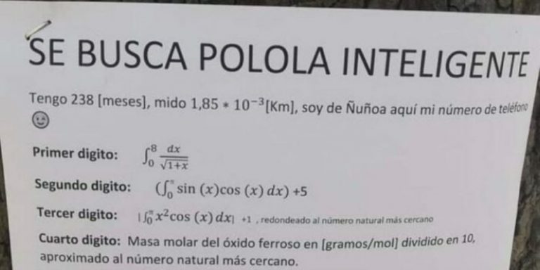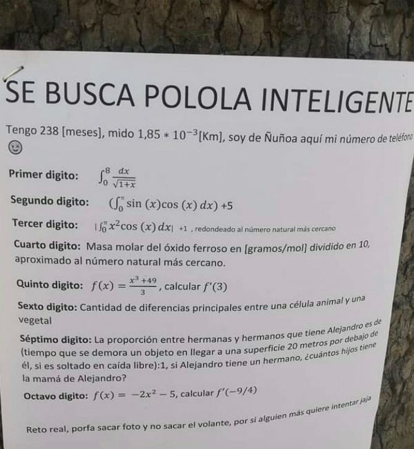 Se trata de un cartel que fue visto en la comuna de Ñuñoa, y en donde una persona dice estar buscando una “polola inteligente”. A continuación da una serie de datos y ejercicios matemáticos, entre otros, para que otra persona pueda descubrir su número de teléfono y así contactarlo.