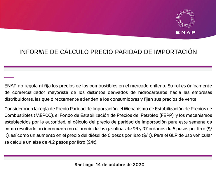 Las bencinas de 93 y 97 octanos tendrán un aumento de 6,0 pesos por litro en su valor. El diesel por su parte, tendrá un agregado de 6,0 pesos por litro. Finalmente, el gas licuado vehicular también se incrementará en 4,2 pesos por litro.