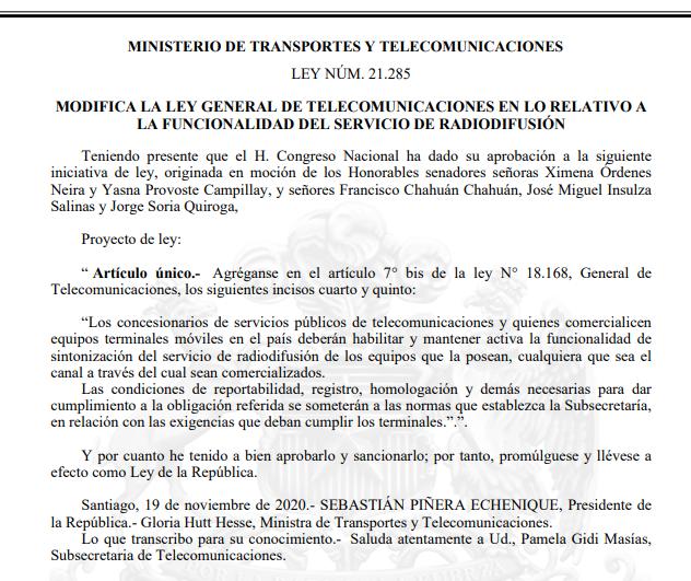 La ley 21.285 tiene un solo artículo: «Los concesionarios de servicios públicos de telecomunicaciones y quienes comercialicen equipos terminales móviles en el país deberán habilitar y mantener activa la funcionalidad de sintonización del servicio de radiodifusión de los equipos que la posean, cualquiera que sea el canal a través del cual sean comercializados. Las condiciones de reportabilidad, registro, homologación y demás necesarias para dar cumplimiento a la obligación referida se someterán a las normas que establezca la Subsecretaría (de Telecomunicaciones), en relación con las exigencias que deban cumplir los terminales».