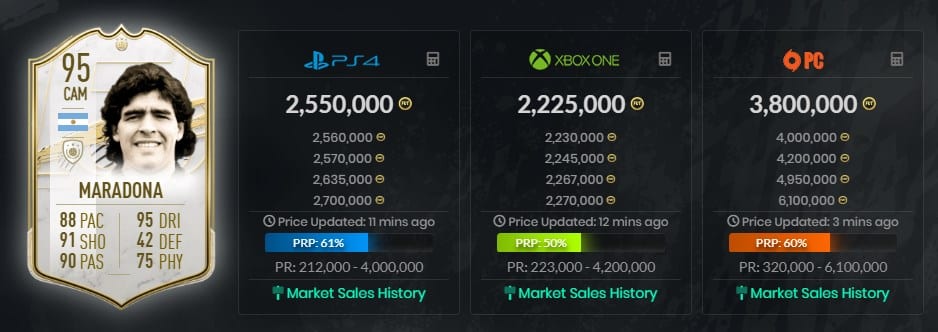 Fue entonces en que el precio en monedas FIFA de las tarjetas de Maradona se elevaron a tal punto que actualmente alcanzan los 2.500.000 y los 3.800.000 dependiendo las plataformas de juego.