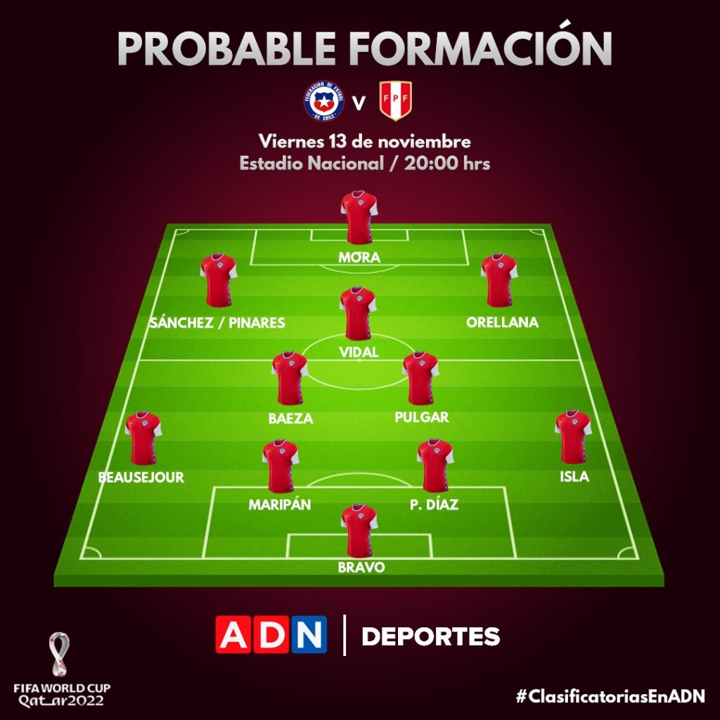 Según reporta ADN Deportes, la oncena sería con Bravo, Isla, Diaz, Maripán, Beausejour. El medio estará compuesto por Baeza, Pulgar y Vidal, dejando en delantera a Orellana, Mora, Sánchez (Pinares).