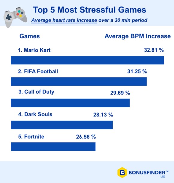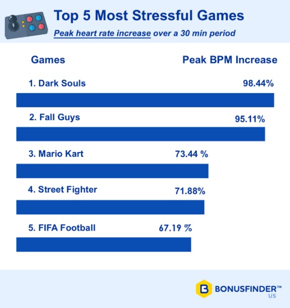 Noticias ¿Está tu favorito? Estudio reveló cuales son los títulos más estresantes para los jugadores Dark Souls III es el título que provocó pulsos de 127 latidos por minuto, siendo el videojuego más estresante según el estudio. Por Diego Puebla Hernández | 16 Nov, 2020. 15:18 hrs Dark Souls III es el título que provocó pulsos de 127 latidos por minuto, siendo el videojuego más estresante según el estudio. Vía Festigame.com En teoría los videojuegos sirven para liberar tensiones y del estrés generado por nuestras actividades diarias, pero hay títulos que provocan todo lo contrario y se pueden llegar a convertir en una verdadera pesadilla. En un estudio realizado por el sitio BonusFinder realizado en colaboración con especialistas y jugadores competitivos dieron a conocer cuales son los títulos que más aumentan los pulsos por minuto y los resultados arrojaron que Mario Kart es el título más estresante en el punto del promedio de ritmo cardiaco que promediaron los jugadores. En el estudio también consideró los juegos que son capaces de elevar el ritmo cardiaco en un momento específico y ahí lidera Dark Souls III, el título marcó un 98,44% cuando los jugadores alcanzaban el jefe Darkeater Midir, el ritmo se elevó hasta los 127 latidos por minutos. estresantes Festigame Futuro y más Juanjo Montecinos continúa el éxito de "Urbanamente Rural" estrenando "La Cucha" y "Florencia" ¿¡Otra vez!? Este YouTuber puso a prueba la resistencia de la PlayStation 5 Sigue a FUTURO.cl en Google Discover Recibe nuestros contenidos directamente en tu feed. Seguir en Google Contenido patrocinado