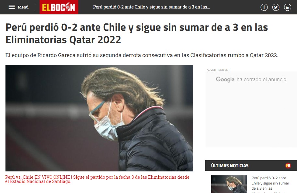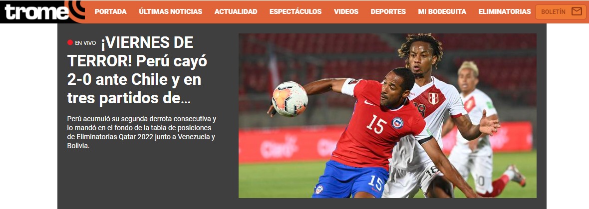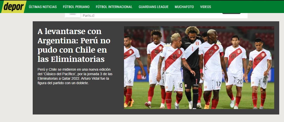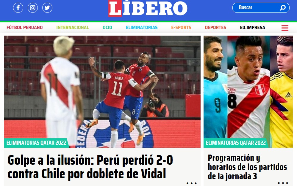 Noticias «Golpe a la ilusión»: Prensa peruana lamenta derrota frente a Chile por Clasificatorias Los medios del “Rimac” confían en que podrán “levantarse” ante Argentina el próximo martes 17 de noviembre. Por Hector Muñoz Tapia | 13 Nov, 2020. 22:35 hrs No hay consuelo en Perú. Lola selección peruana llegó a Santiago confiada en las últimas dos victorias que consiguieró ante Chile en partidos oficiales, pero en el Estadio Nacional se encontraron con la triste realidad de que nunca pudieron ganar en Santiago por los puntos. Prueba del dolor del Rimac fueron las portadas de los principales medios deportivos peruanos, quienes acusaron el golpe y pidieron a su selección que se levanten de una vez por todas ante Argentina. «Perú perdió 0-2 ante Chile y sigue sin sumar de a 3 en las Eliminatorias», escribió El Bocón, mientras que Depor esgrimió: «A levantarse con Argentina: Perú no pudo con Chile en las Eliminatorias». En la misma tónica se mostró Líbero: «Golpe a la ilusión: Perú perdió 2-0 contra Chile por doblete de Vidal“, para que finalmente Trome comentara que: “¡VIERNES DE TERROR! Perú cayó 2-0 ante Chile y en tres partidos de Eliminatorias solo suma un solo punto». Revisa las reacciones… Chile deportes La Roja Perú qatar 2022 "Satán" confirma secuela de "Constantine" 15 años después de la primera Arturo Vidal tras victoria ante Perú: "Luchar por estar en el Mundial es más importante que mis goles" Sigue a FUTURO.cl en Google Discover Recibe nuestros contenidos directamente en tu feed. Seguir en Google Contenido patrocinado