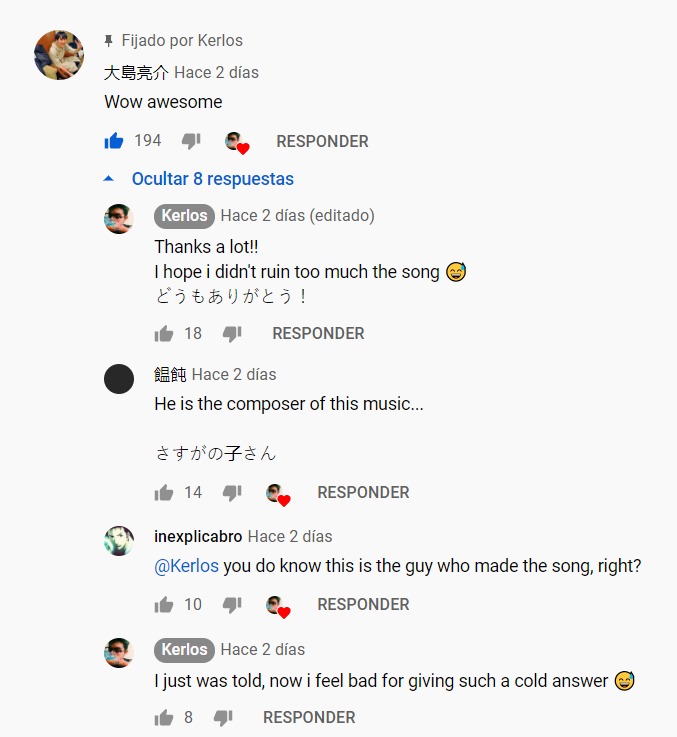 El chileno entregó declaraciones a Los40.cl y contó lo ocurrido. “Al tener un canal de covers de anime, estoy acostumbrado a recibir comentarios en japonés. Al no saber mucho del idioma aplico traductor y sentido común, así que cuando llegó el comentario de Ryosuke Oshima no caché”, comenzó diciendo.