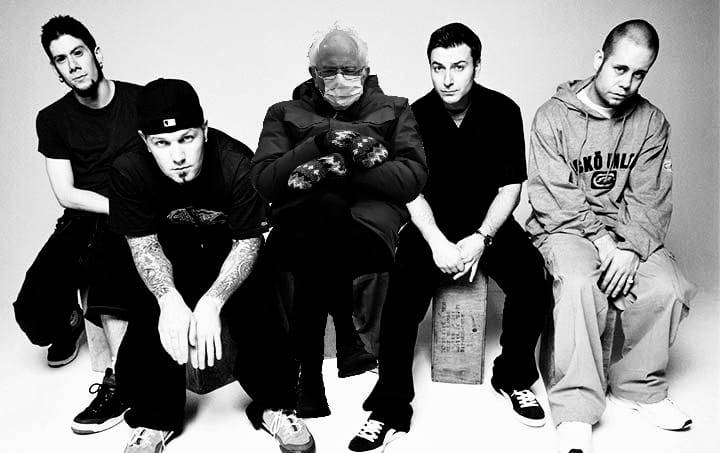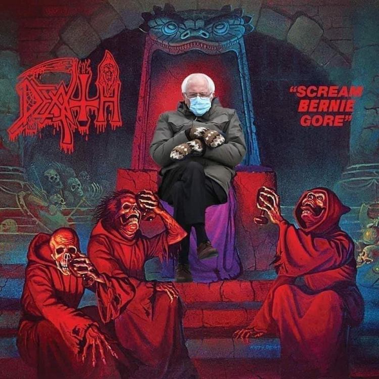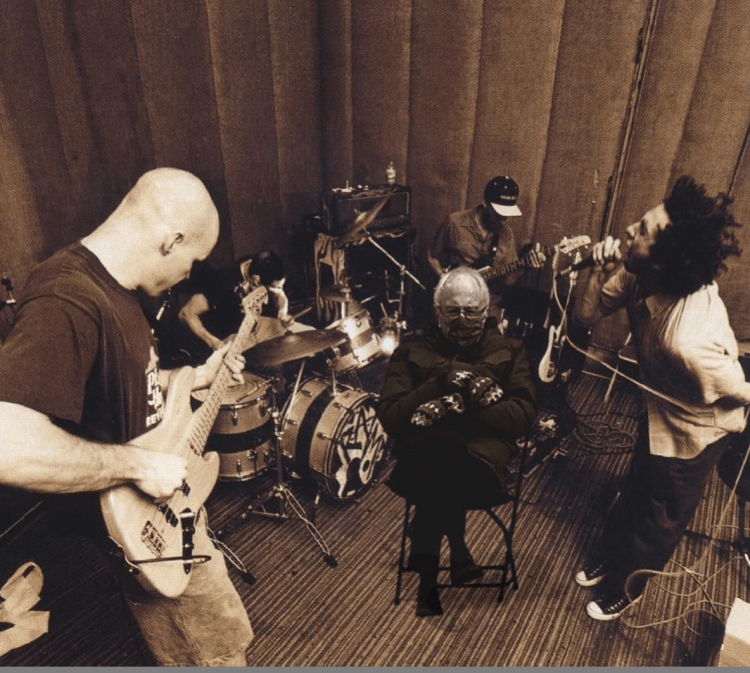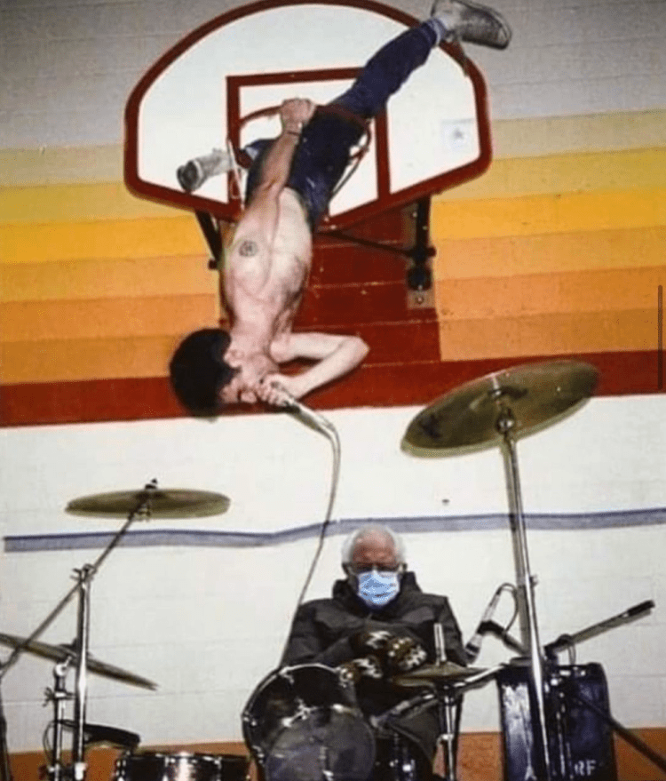 Desde carátulas de discos de Death, Black Sabbath, Megadeth, Guns N’ Roses, Hüsker Dü, hasta pose con Limp Bizkit, un ensayo con Rage Against The Machine, sentado tocando batería y hasta viendo a una banda de niños rockeando, hay cuerda para rato con Bernie Sanders y un meme para la historia.