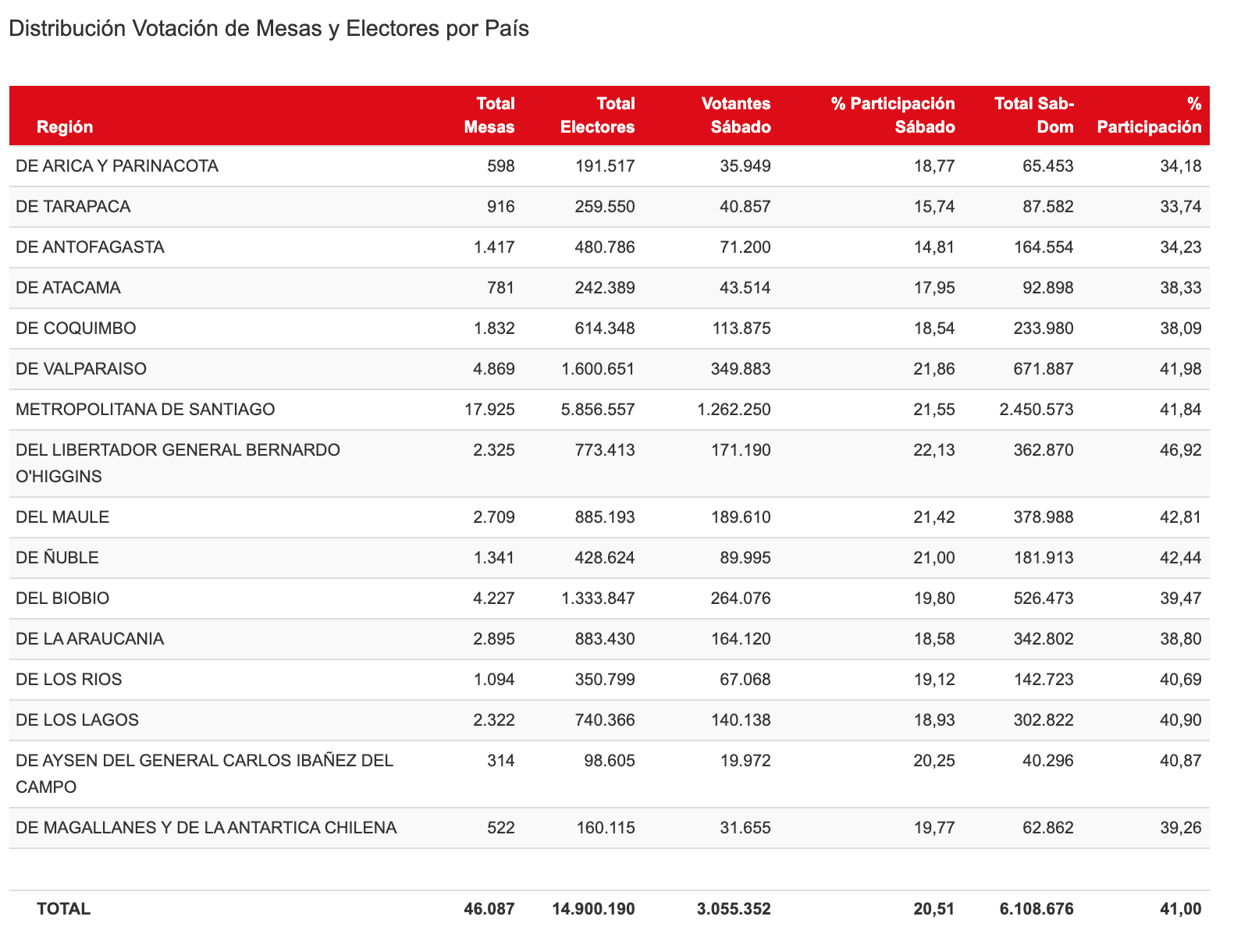 El siguiente cuadro se observa la participación por región. También se detalla cuántos electores acudieron a votar el sábado y cuántos el domingo.