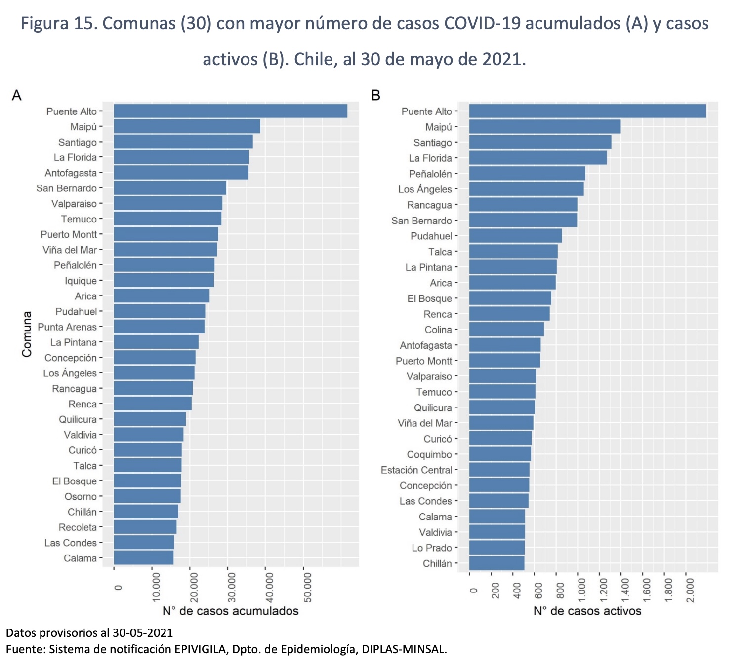 Los datos de las comunas con más casos activos fueron recogidos a través del sistema Epivigila.
