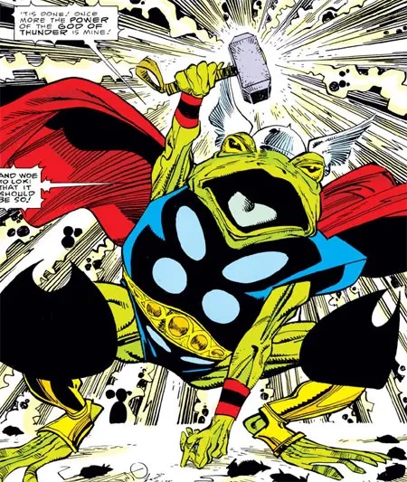 Uno de los primeros guiñosque aparecen en el capítulo recupera a uno de los conceptos más alocados de los cómics: Throg, la rana con el poder del Dios del Trueno. En «The Mighty Thor: #365», Loki transforma a Thor en una rana, lo que da pie a una aventura en la que inevitablemente lo vemos portando al martillo en su versión anfibia. A ese número hacen referencia las letras del jarro en el que aparece esta variante que infructuosamente intenta hacerse de Mjölnir.