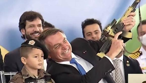 Este momento se desarrolló ante cientos de personas que aplaudieron en el instante que Jair Bolsonaro se sacó fotografías con el niño e incluso, tomó este fúsil de juguete y posó con él.