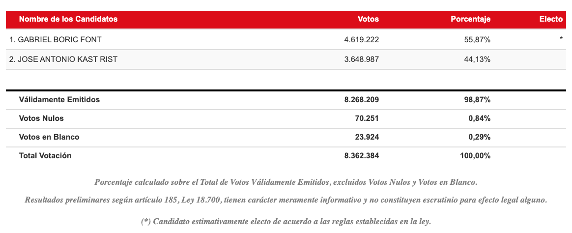 - GABRIEL BORIC FONT 4.619.222 55,87% (PRESIDENTE ELECTO)