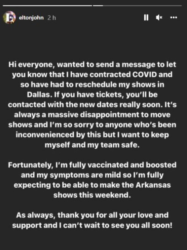 Elton John comunicó a través de sus redes sociales que dio positivo a COVID-19 durante los conciertos de su gira de despedida. Por este motivo, se vio olbigado a cancelar dos fechas en Estados Unidos.