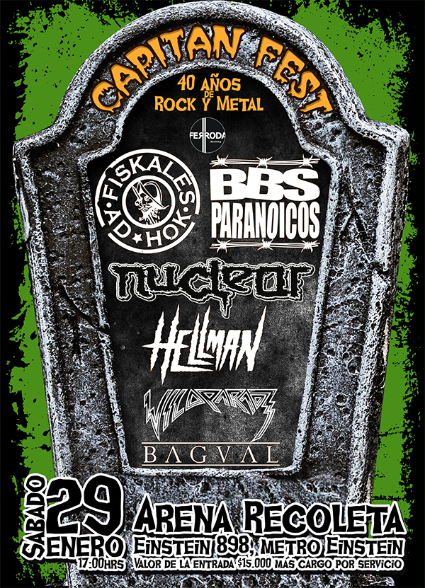 Música en vivo para este mes en Santiago, se anunció el evento Capitán Fest, que tendrá en el escenario del Arena Recoleta a las bandas: Fiskales Ad-Hok, BBS Paranoicos, Nuclear, Hellman, Wild Parade y Bagual.