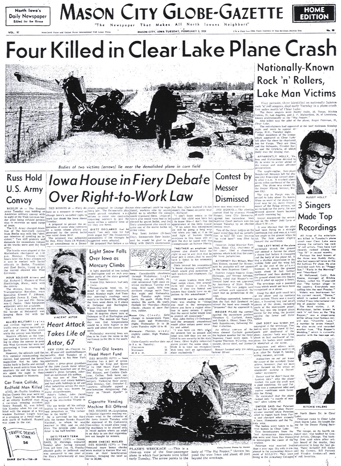 Independientemente de las contradicciones, alrededor de las 00:55 del 3 de febrero, el avión que transportaba a Holly, Richardson y Valens despegó en medio de una tormenta de nieve con fuertes vientos. Pero viajó solo unos pocos kilómetros antes de estrellarse, matando a los cuatro hombres al instante. En el día en que murió la música.