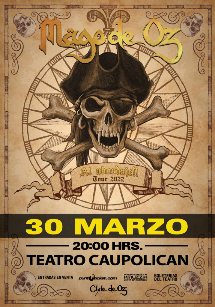 Los españoles Mägo de Oz vuelven a nuestro país a fin de mes. Estarán el miércoles 30 de marzo en el Teatro Caupolicán con el show de su “Al Abordaje Tour”, en que presentan su nuevo disco Bandera Negra. Y cumplen finalmente con esta visita, que al igual que muchos conciertos, sufrió varias postergaciones en estos últimos dos años. Las entradas están en sistema Puntoticket y tienda Kmuzzik.