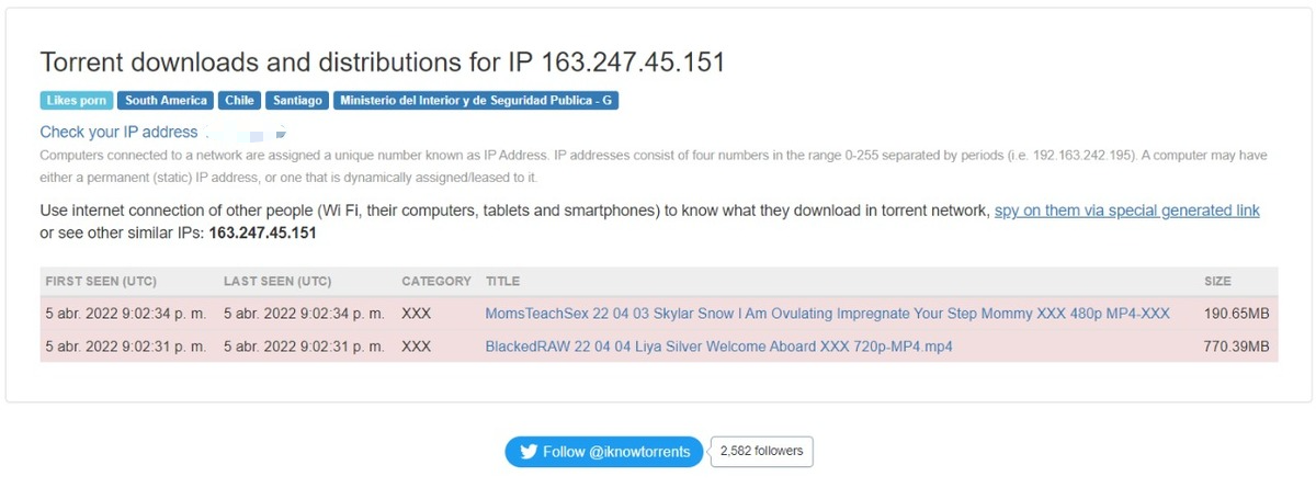 Tal como lo hizo meses atrás, Sebastián ingresó en la red Iknowwhatyoudownload.com (que permite ver descargas efectuadas por Torrent) una de las IP asignadas a cuentas estatales para realizar la comprobación a modo de ejemplo para la historia que estaba recordando.