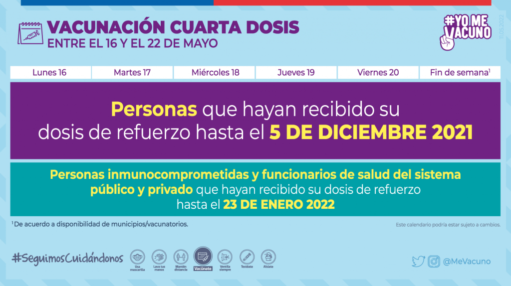Entre el lunes 16 y el domingo 22 de mayo, las personas de 18 o más años que hayan recibido su dosis de refuerzo hasta el 05 de diciembre de 2021, podrán inocularse con la cuarta dosis.