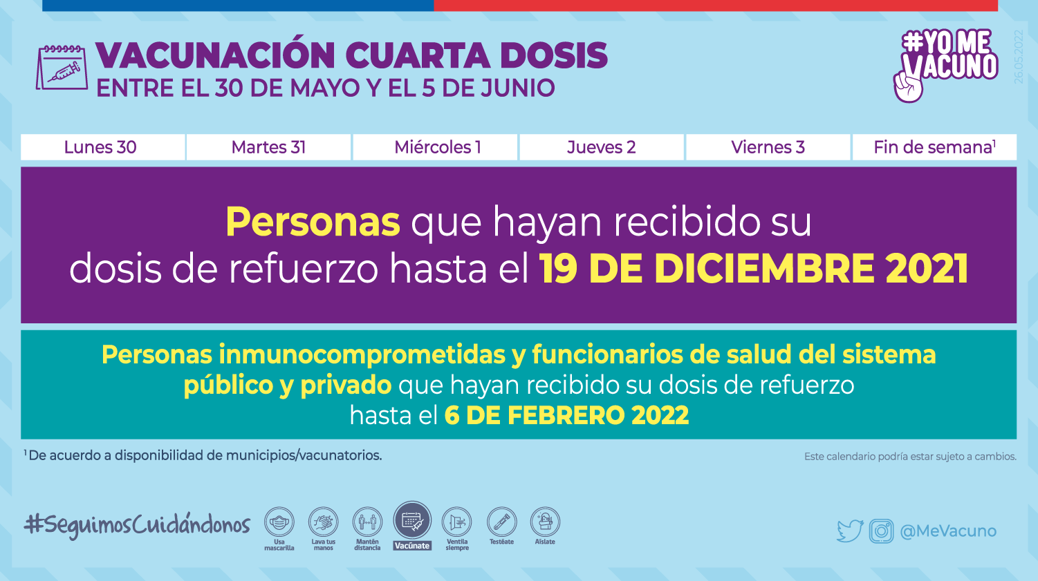 Entre el lunes 30 de mayo y el domingo 05 de junio, las personas de 18 o más años que hayan recibido su dosis de refuerzo hasta el 19 de diciembre de 2021, podrán inocularse con la cuarta dosis.