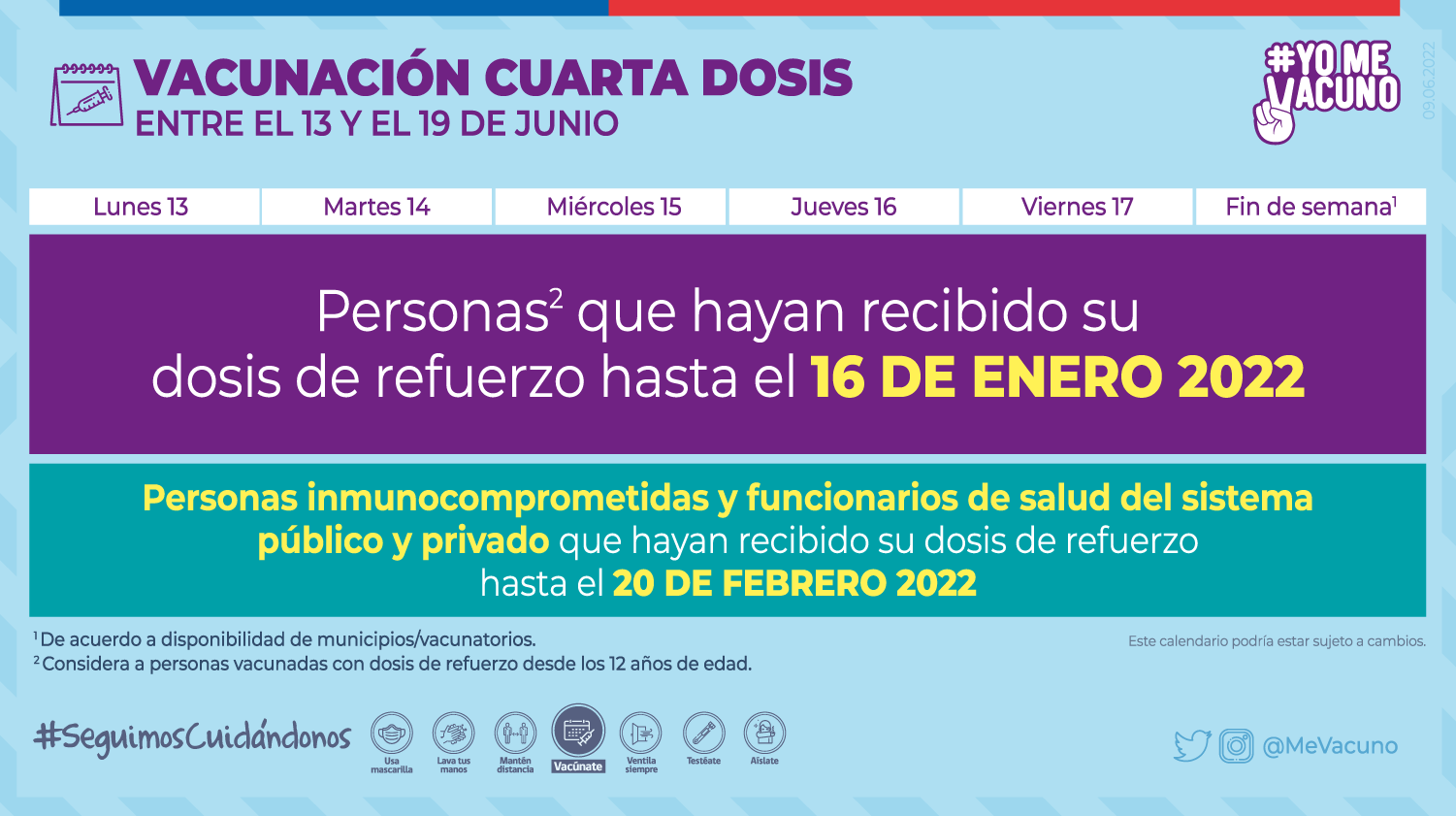 Entre el lunes 13 y el domingo 19 de junio, las personas de 18 o más años que hayan recibido su dosis de refuerzo hasta el 16 de enero de 2022, podrán inocularse con la cuarta dosis.