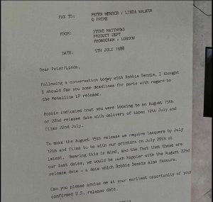 En esta carta, impresa en el libro … «And Justice For All» que se encuentra en la caja de reedición del álbum, parece que la banda inicialmente esperaba una fecha de lanzamiento para el 15 de agosto.