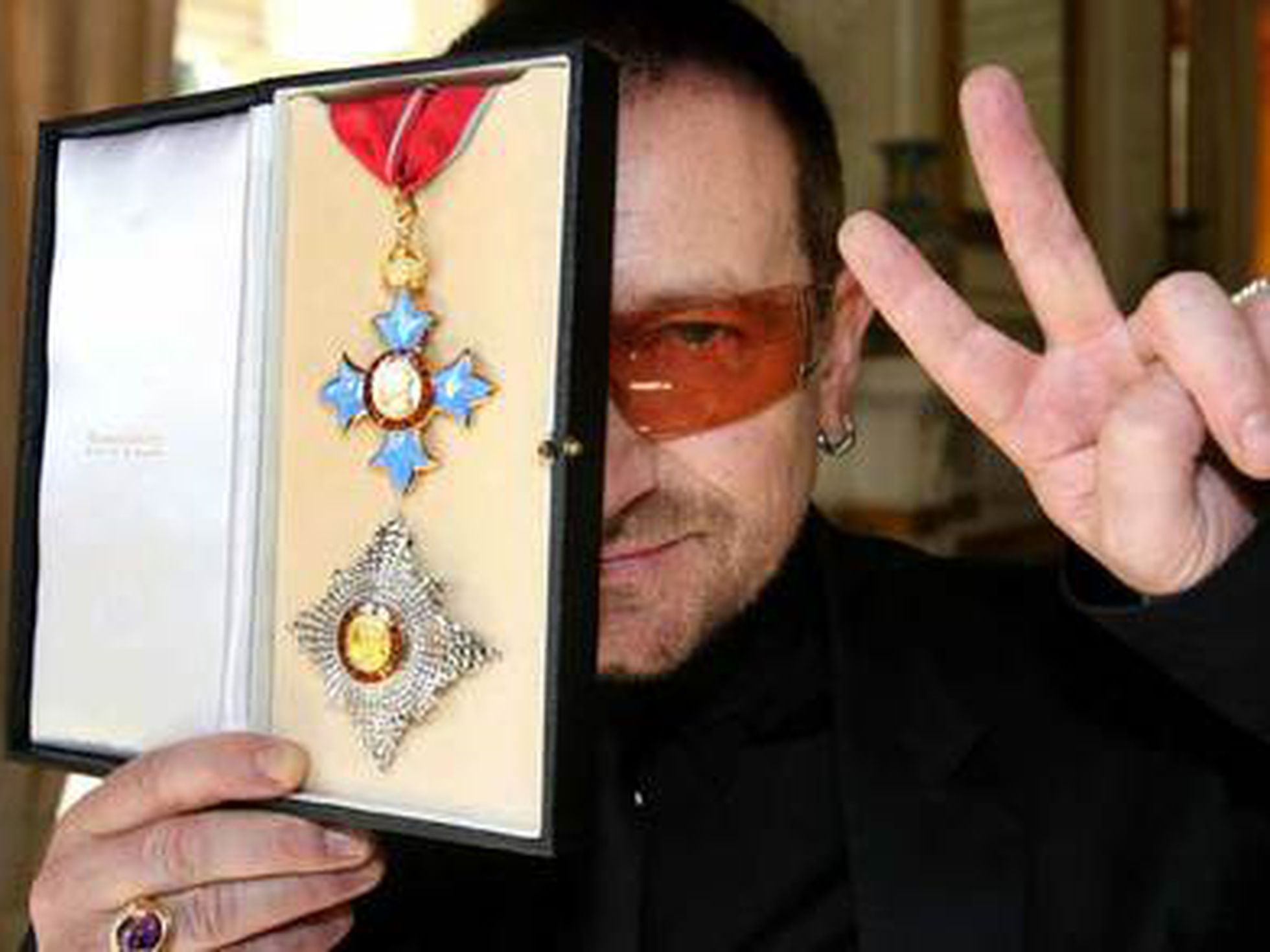 En 2007, el cantante de U2 fue nombrado caballero honorario por la reina Isabel II por su labor musical y benéfica, aunque ella no llevó a cabo la ceremonia. Debido a la ciudadanía irlandesa de Bono, recibió el honor del embajador David Reddaway en Dublín.