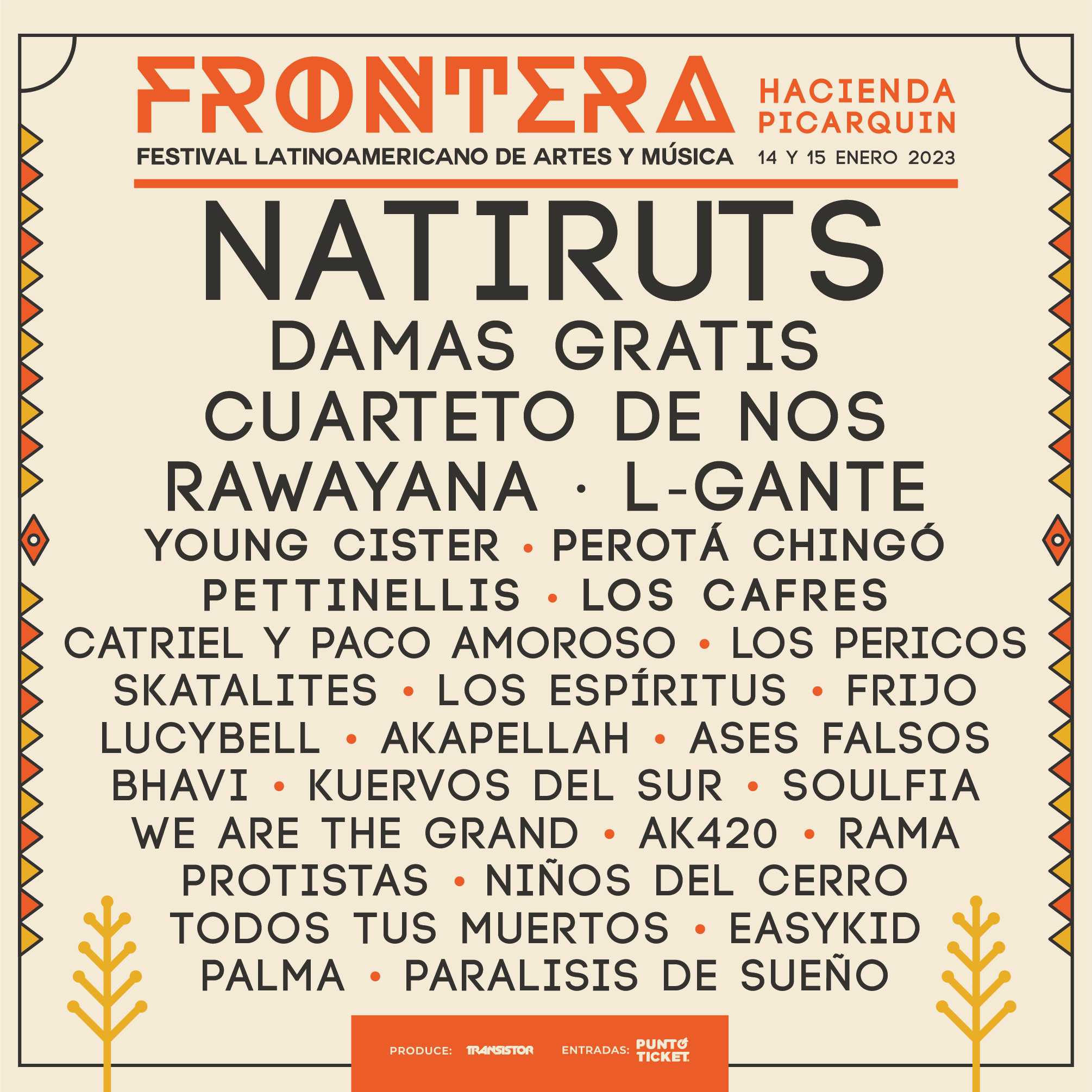 Dos jornadas memorables con 30 agrupaciones en total que integran el Cartel de Frontera 2023: Natiruts, Damas Gratis, Cuarteto de Nos, L-Gante, Young Cister, Rawayana, Perotá Chingó, Pettinellis, Los Cafres, Akapellah, Ases Falsos, Los Pericos, Skatalites, Los Espíritus, Javiera Mena, Stailok, Frijo, Lucybell, Catriel y Paco Amoroso, Bhavi, Kuervos del Sur, Soulfia, We Are The Grand, AK4:20, Rama, Protistas, Niños del Cerro, Todos tus muertos, Easykid, PALMA y Parálisis del sueño.